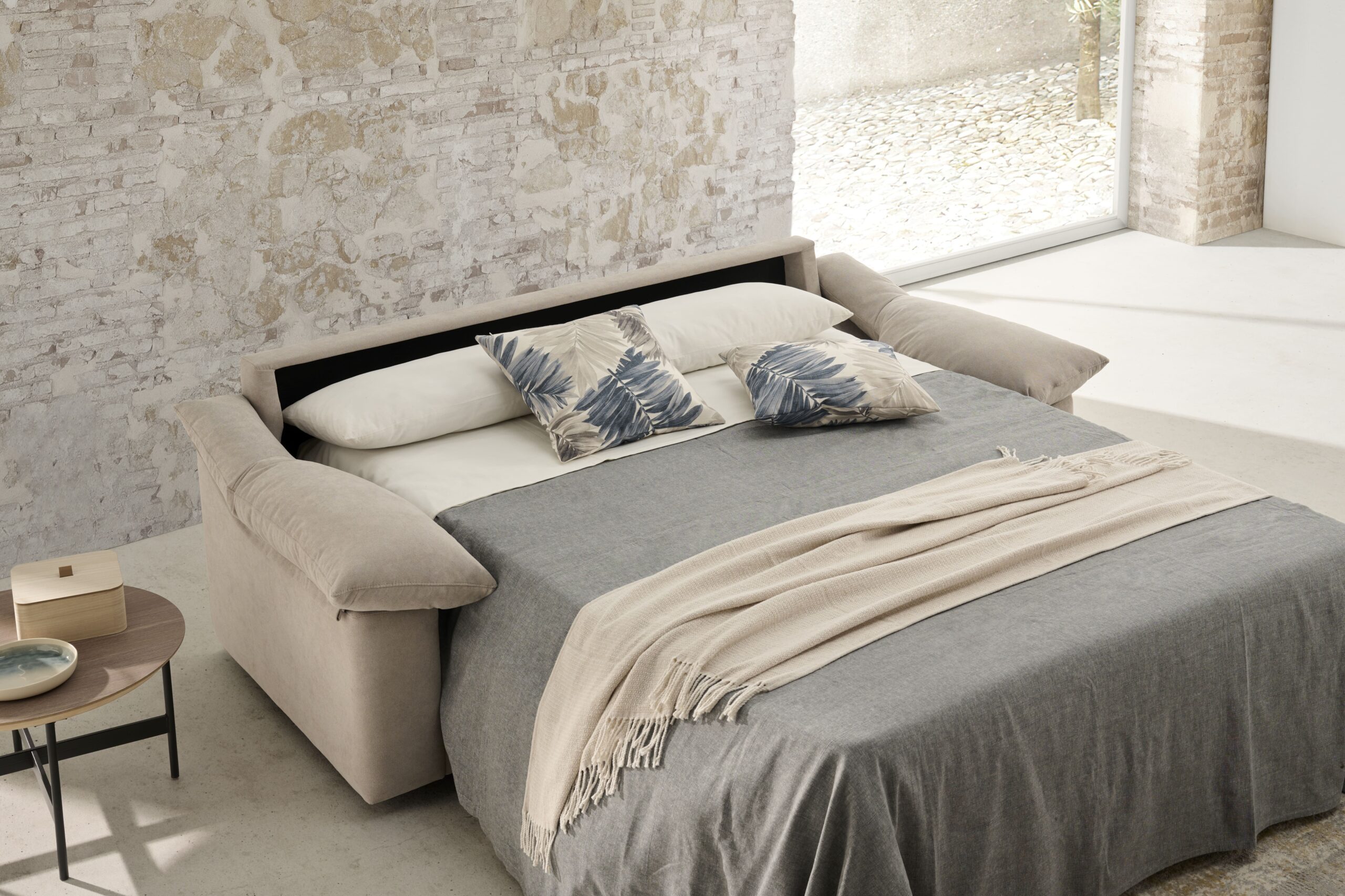 Sistema de apertura italiano, armazón de madera de pino y tablero de partículas recubierto de espuma PUR de varias densidades. Mecanismo interno metálico antioxidante, pintado con epoxi y acabado en resina.