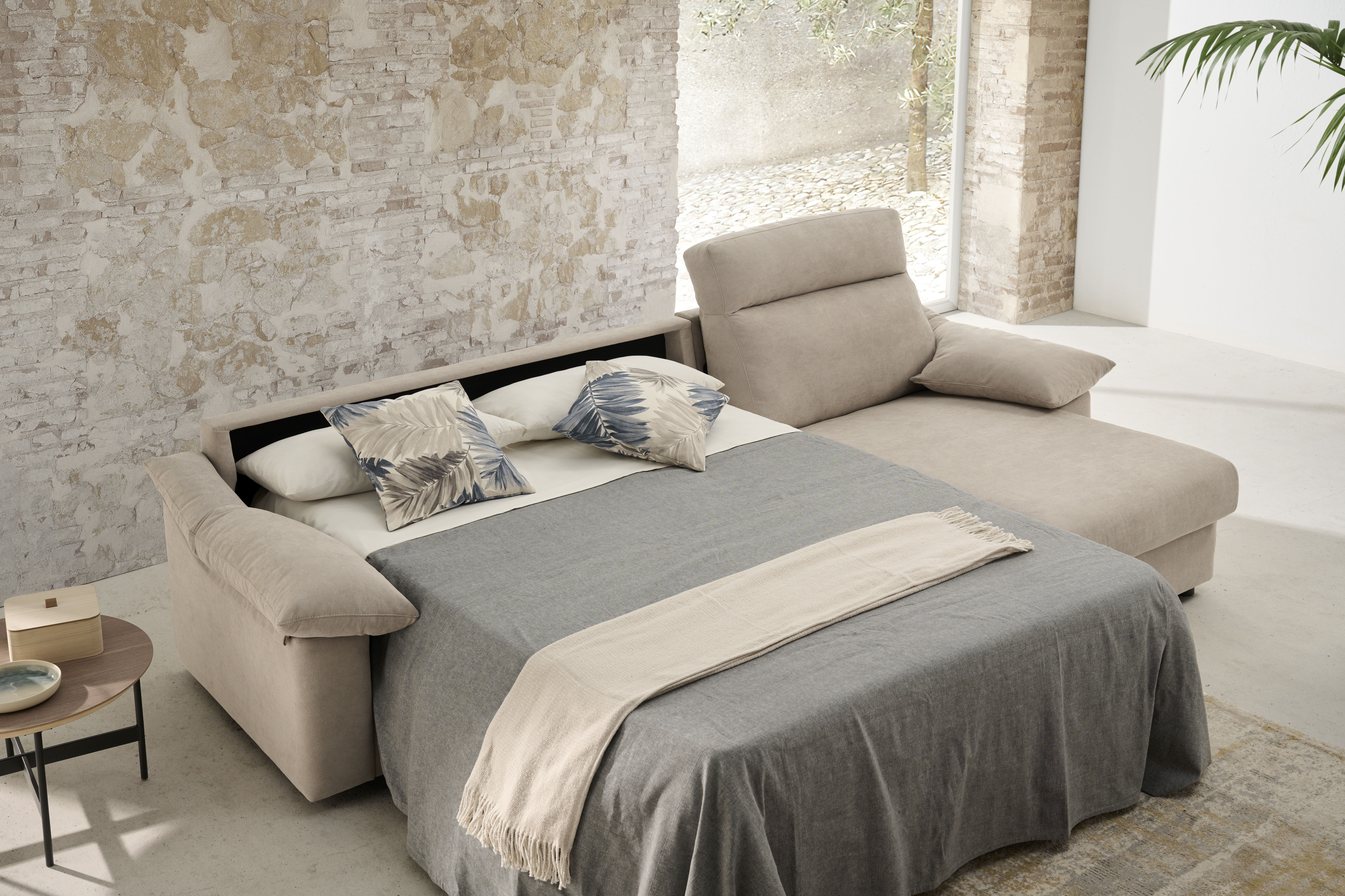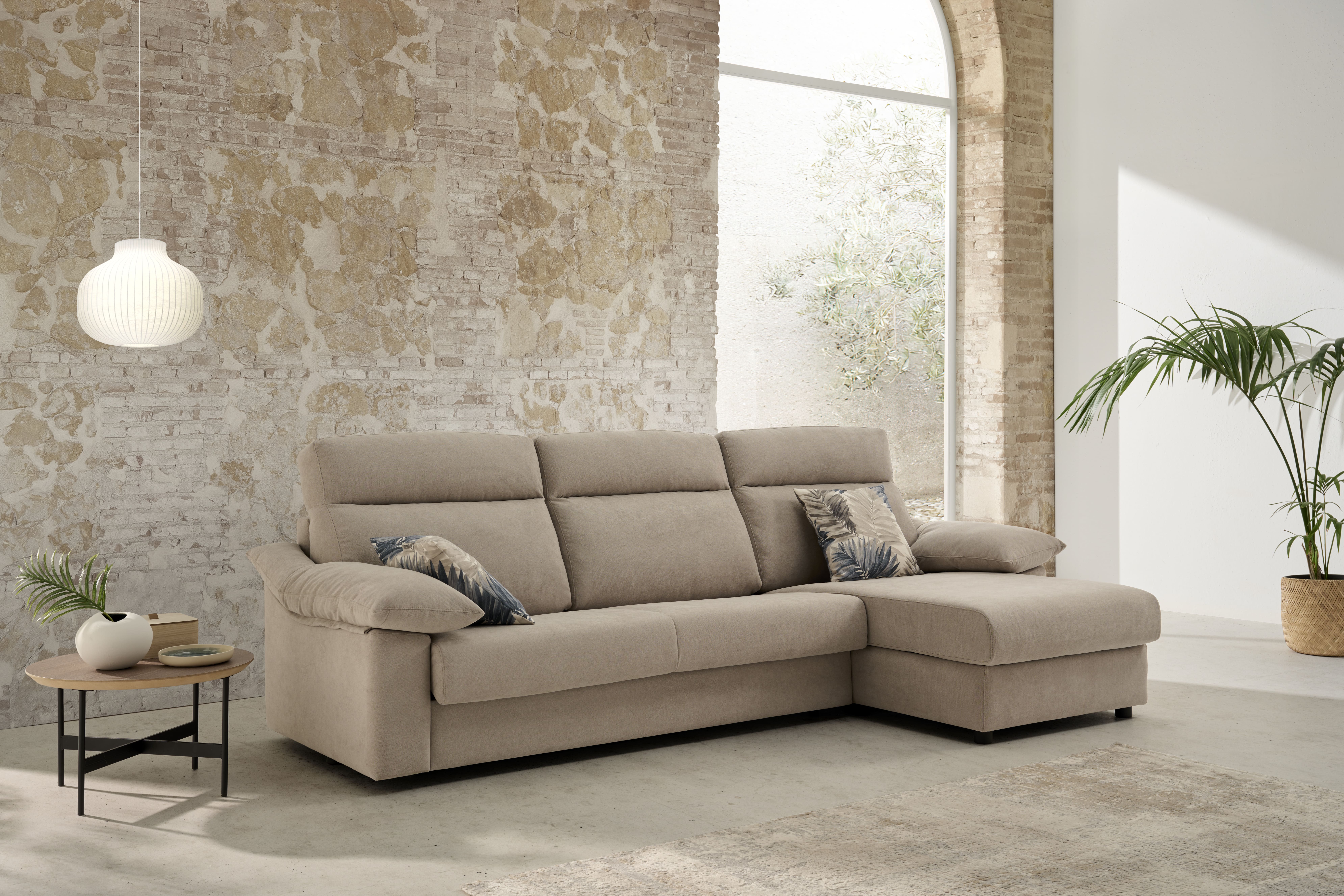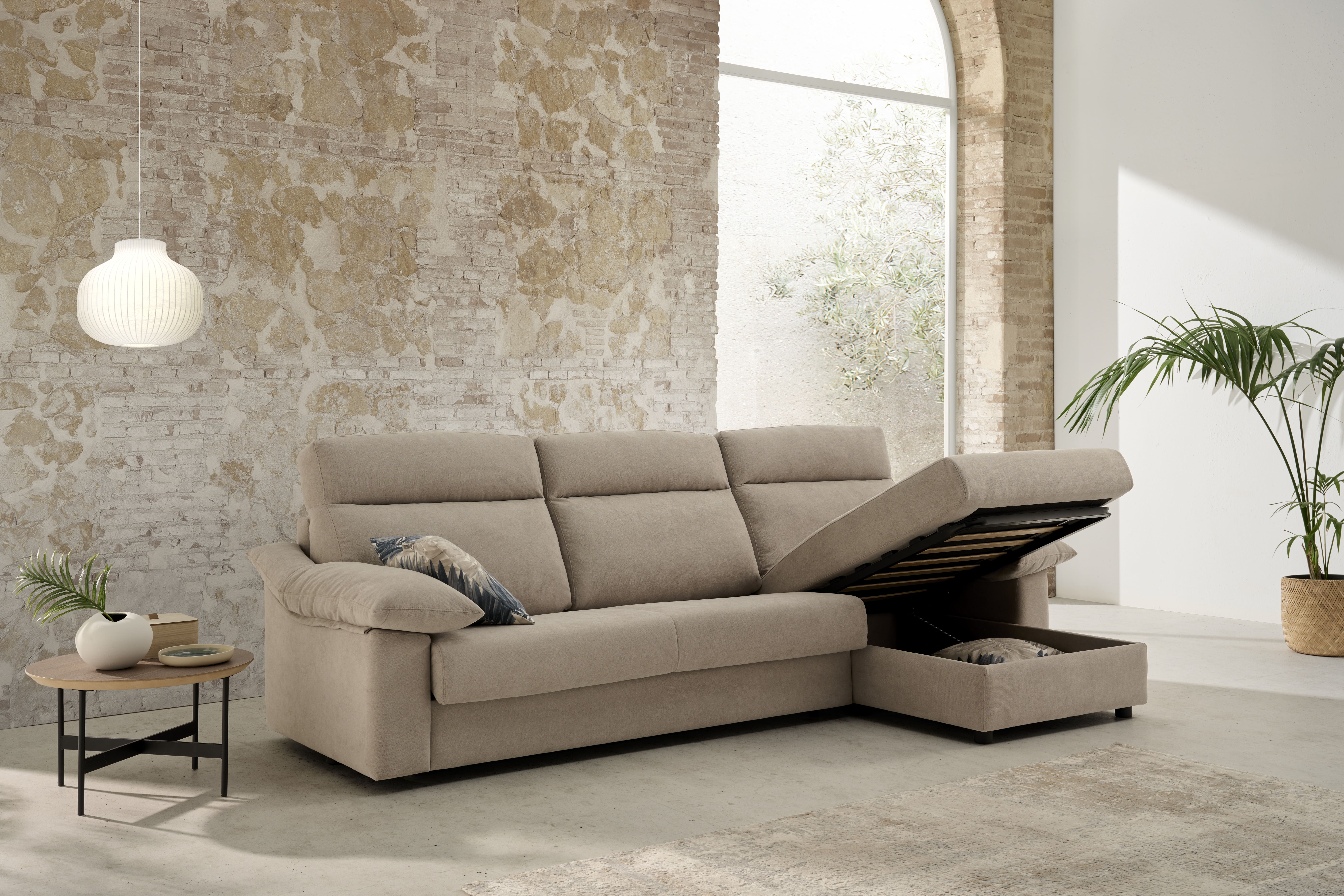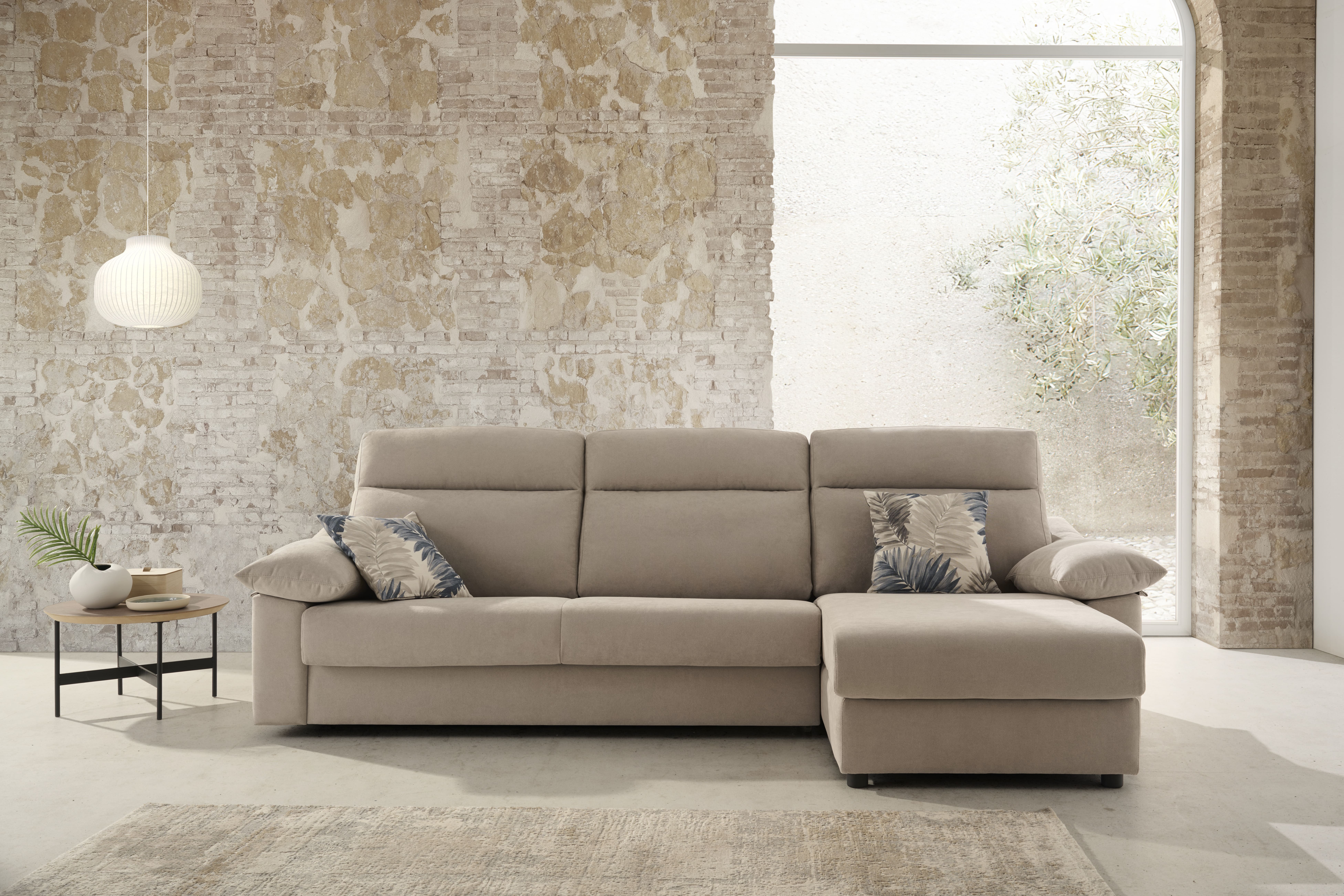 Sofá cama con colchón de 140×200 cm, con distintos modelos a elegir. Chaise longue a juego opcional con arcón. Garantía del mecanismo: 5 años.