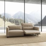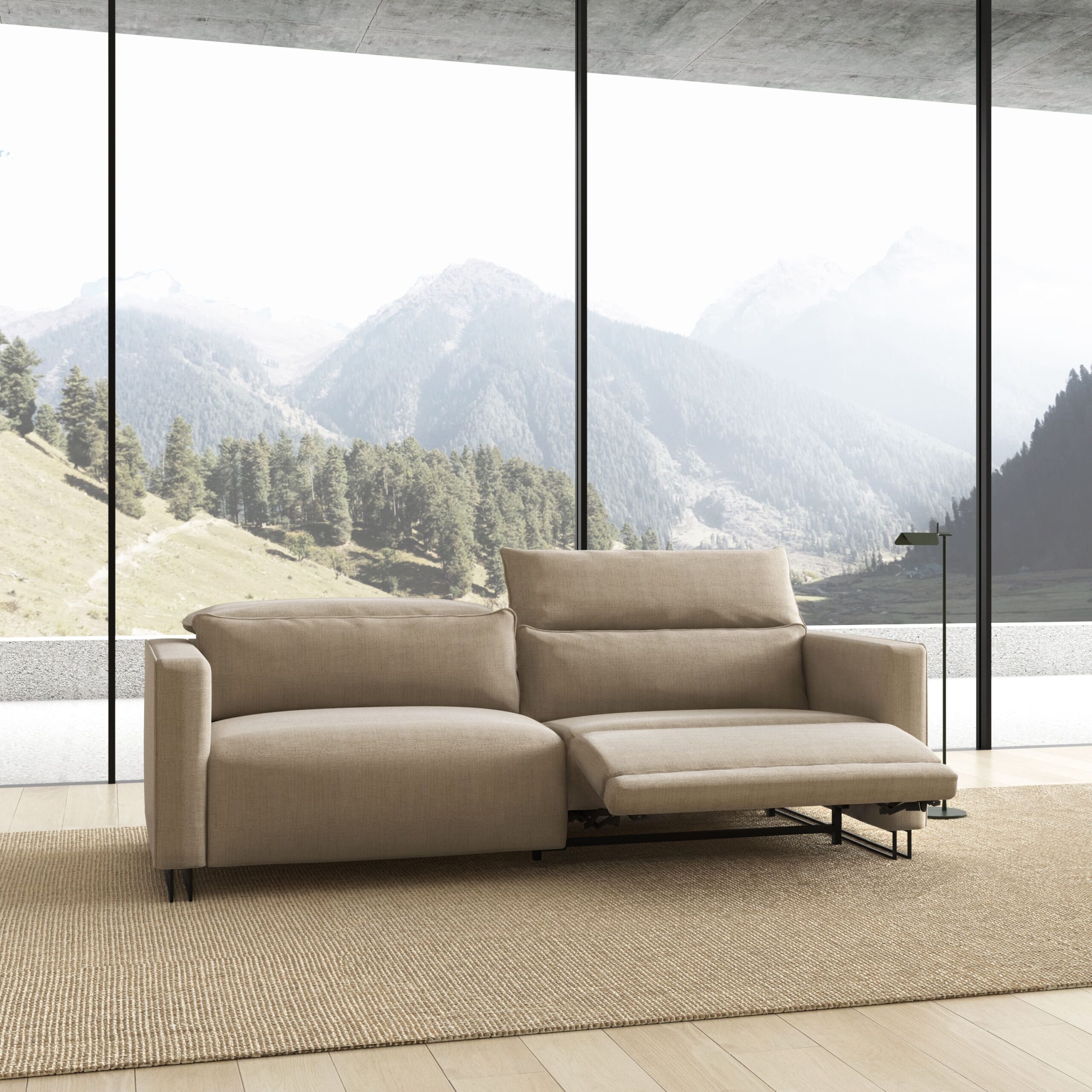 Perfecto para los amantes de lo práctico y lo esencial: un sofá relax con cabecero abatible y reposapiés oculto que destaca por sus líneas rectas y sencillas.